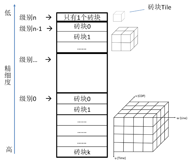 LDM技术主要基于两项假设,第一假设是SEGY数据(一种标准地震数据体记录格式)包含的空间范围较大,但在某一时刻的用来计算的数据所在的空间位置却是局部的,局部之外的数据对此一时刻的计算来说是无意义的。第二假设是对局部数据在精细度方面的要求以及对不同场景使用的计算方法的需求是不一样的,各种计算方法可以灵活处理。为了达到这两个假设的目标,LDM技术对数据的管理原则是:按空间位置分块,按精细度分层(图2)。考虑到处理数据时的便捷性,各块各层数据的大小相同(默认大小为64x64x64个数据采样点,在LDM中称为Tile,以下统一称为砖块),在相邻的两层数据之间,下层数据块的精细度在u、v、w三个维度上都是上层的2倍,数据块的数量是上层的8倍,这就非常适合用八叉树结构来管理这些数据块。这样用户在处理数据时,只需要根据空间位置定位需要的那些数据块,再根据计算机的内存、显存、显示器的分辨率、实时性等要求筛选出适当精细层当中的数据块进行处理。在存储时都是最先变化u,再变化v,最后变化w。
